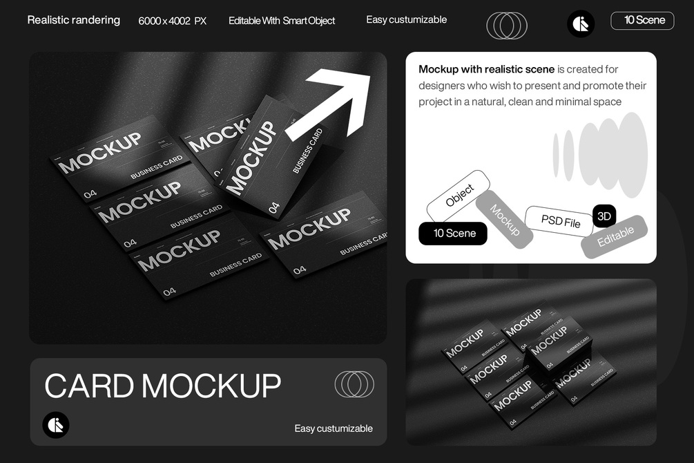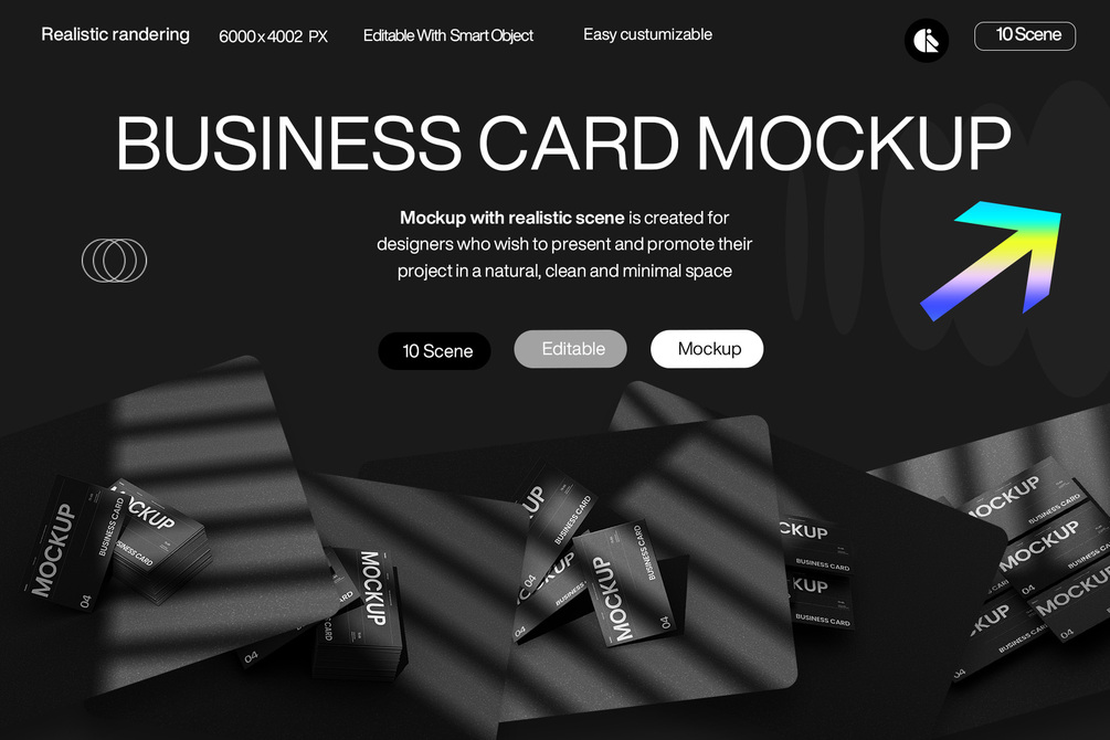 Showcase your business card designs with this elegant black business card mockup, featuring a stylish shadow overlay effect. Perfect for presenting your branding, logo, and business card concepts in a professional and sophisticated manner. This mockup offers a realistic and high-quality representation, ideal for designers and businesses looking to make a strong visual impact. Easy to customize with your own designs, this template is a valuable addition to your presentation toolkit.